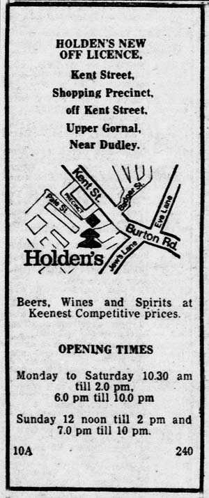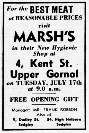 Early 1960s advertisement. 22. Annie Elizabeth Sadler, shopkeeper. (Confectionary Business -1921 Census) 29. Gertie Allen (Miss), haberdasher. 31. Edith & Alice Williams (Misses), drapers. 47. William Henry Stanley, butcher. (Master butcher -1921 Census) 50. Joseph Woodhall, boot repairer. 57. Abel Beardsmore, boot factor. 58. James Watchorn, boot maker. 59. Harry Lampitt, upholsterer. 80. Martha E.W. Marsh, butcher. (Alice Marsh, fruiterer -1921 Census) 83. Leonora Smith (Mrs), confectioner. 91. Hannah Winnington (Mrs), draper. 96. Frederick Bradley, maltster. 103. Albert Bradley, grocer also at 104, draper. (1921 Census; Baker working for F. Bradley, Baker & Maltster) 107. James Blunn, grocer. (1921 Census; grocer & provision merchant) Dudley Co-operative Society Limited. (David Hadlington, manager) Edward Williams, saddler. Ida Harris, shopkeeper. Henry Harris, hair dresser. Herbert Jackson, hair dresser. Henry Marsh, greengrocer. Gladys Honor & Ethel Maud Smith (Misses), drapers. 'The Arches', George Weaver, shopkeeper.