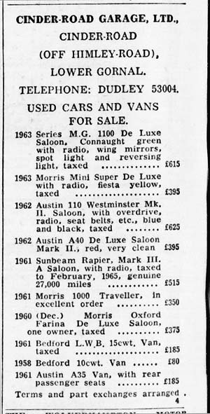 Cinder Road Garage advert 1964.